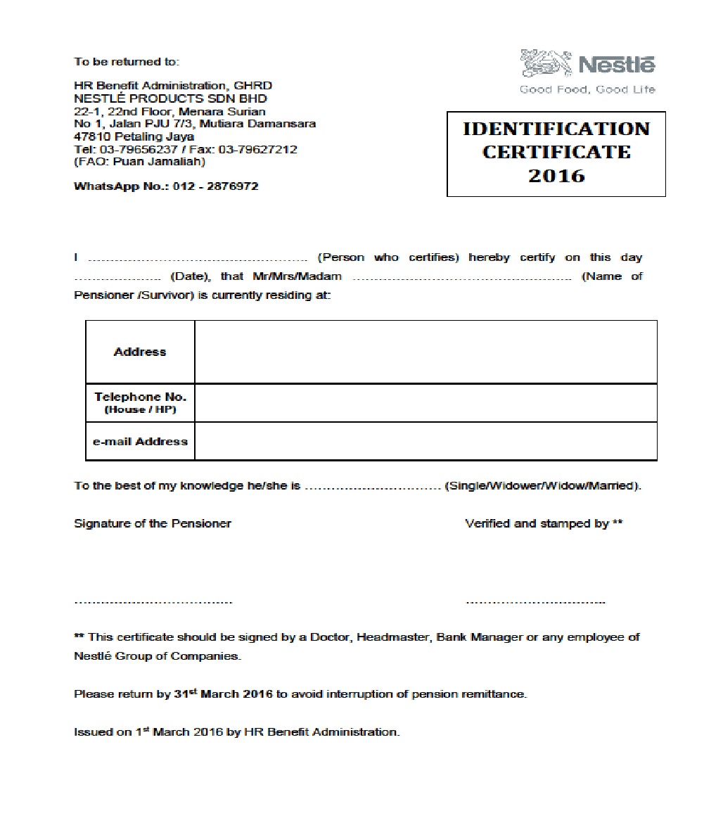 Malaysia Nestle Retirees Nestle Identification Certificate 2016