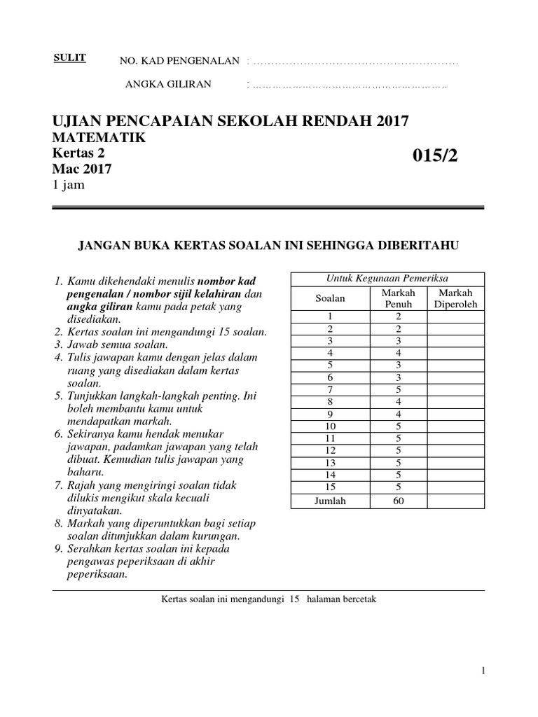 Ujian Pencapaian Sekolah Rendah 2017 Matematik Kertas 2 Mac 2017