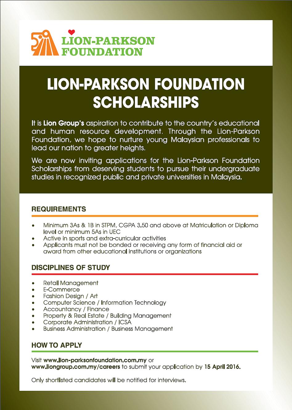 Utar On Twitter Lion Parkson Foundation Scholarship Awards 2016 If Interested Please Refer The Attachment Thank You Deas Https T Co Mntykqhfou